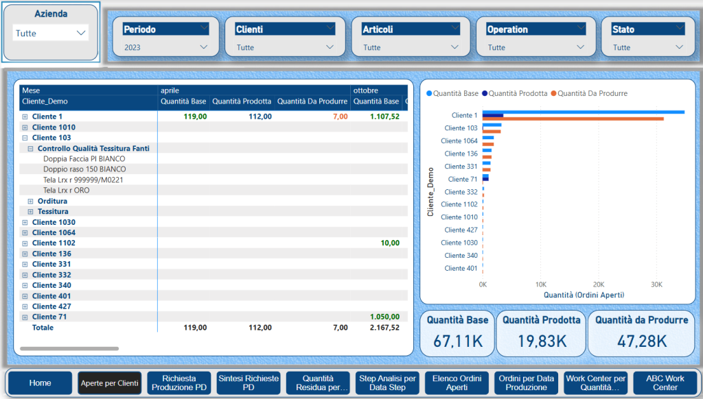 Nel report di esempio – qui sotto – vediamo l’analisi del dato di produzione nei vari mesi di analisi spaccato per Clienti, per Fase della produzione e per Articolo, con la possibilità di arrivare nel dettaglio per ogni singolo prodotto ordinato, di capire quanto è stato ordinato, quanto è stato prodotto e quanto resta da produrre, e con informazioni aggiornate quotidianamente sia per le pianificazioni interne sia da poter dare ai clienti.