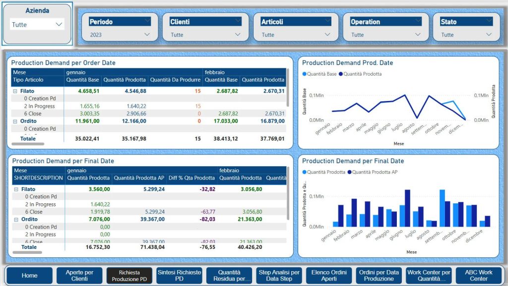 Tra le varie pagine di analisi presenti nel modello abbiamo anche predisposto la visualizzazione della quantità ordinata, prodotta e da produrre, suddivisa nei vari mesi sia per data Richiesta che per la data Confermata, analizzando il dato per Fase e Stato di produzione (Creation, in Progress e Close). Anche in questo caso, come per qualsiasi report, mantenendo la struttura appena descritta si può andare poi nel dettaglio, magari selezionando un singolo cliente nel selettore Clienti, così da monitorare tutto l’ordinato di ogni cliente o articolo.